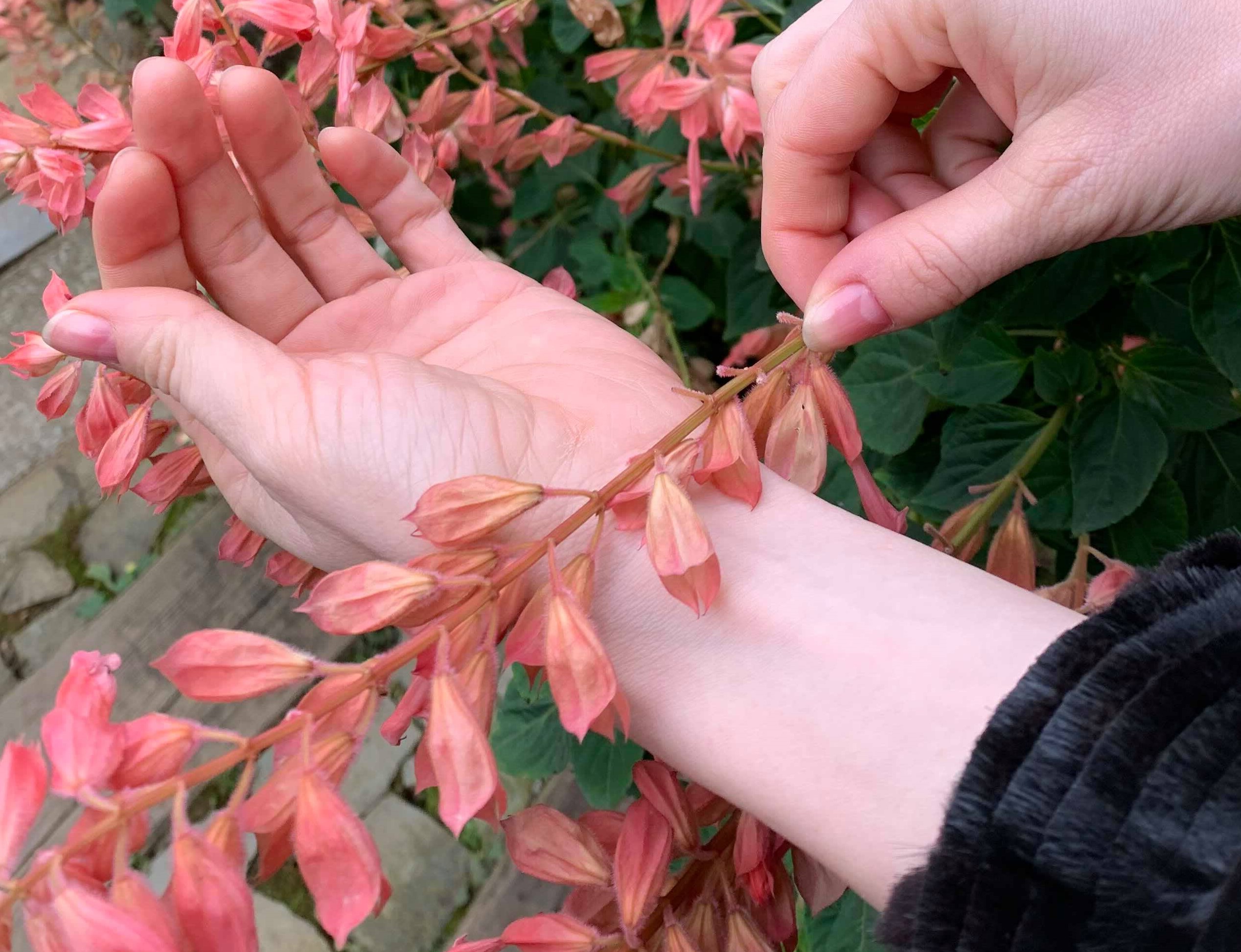 So let’s talk flowers. Flowers and plants are the easiest guide to finding all sorts of colors that flatter the skin so here’s what you can do to find the ones for you. Go to your nearest garden center, on a hike, in a park, or even in your back yard and just start taking pictures of your skin with those colors. Collect as many color samples as you can of colors you both love to look at and ones you’d love to wear. Arrange the colors by the basic categories such as pinks, purples, blues, greens etc. Once organized, these colors can be added into your color palette to inspire your make-up looks, wardrobe, accessories, perhaps even some interior decorating. The ideas are endless! Take a look at some of the samples I took.