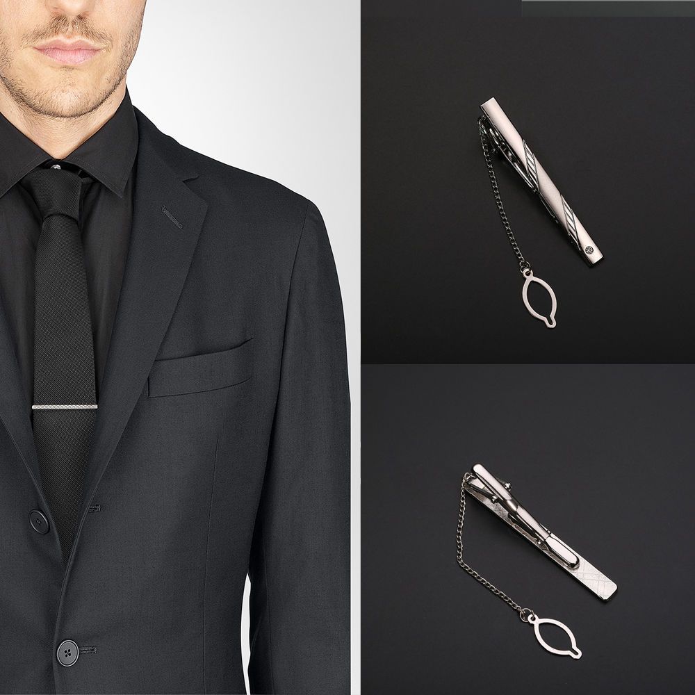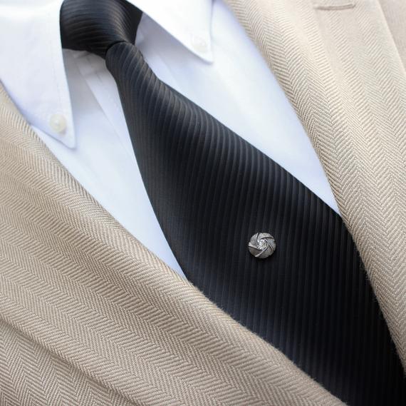 A tie clip or also known as a tie bar (although some call these tie pins) is a bar that securely fits across the tie and connects to your shirt underneath so that the tie can only move from below the pin. This accessory is more noticeable and divides your tie into two parts drawing the viewers eye directly to its shiny surface. Keeping that in mind, remember it will be the show piece of your tie so choose wisely! Too gaudy for a job interview may not go over very well or be taken seriously. Consider your fashion and the appropriate time to wear the more special pieces.