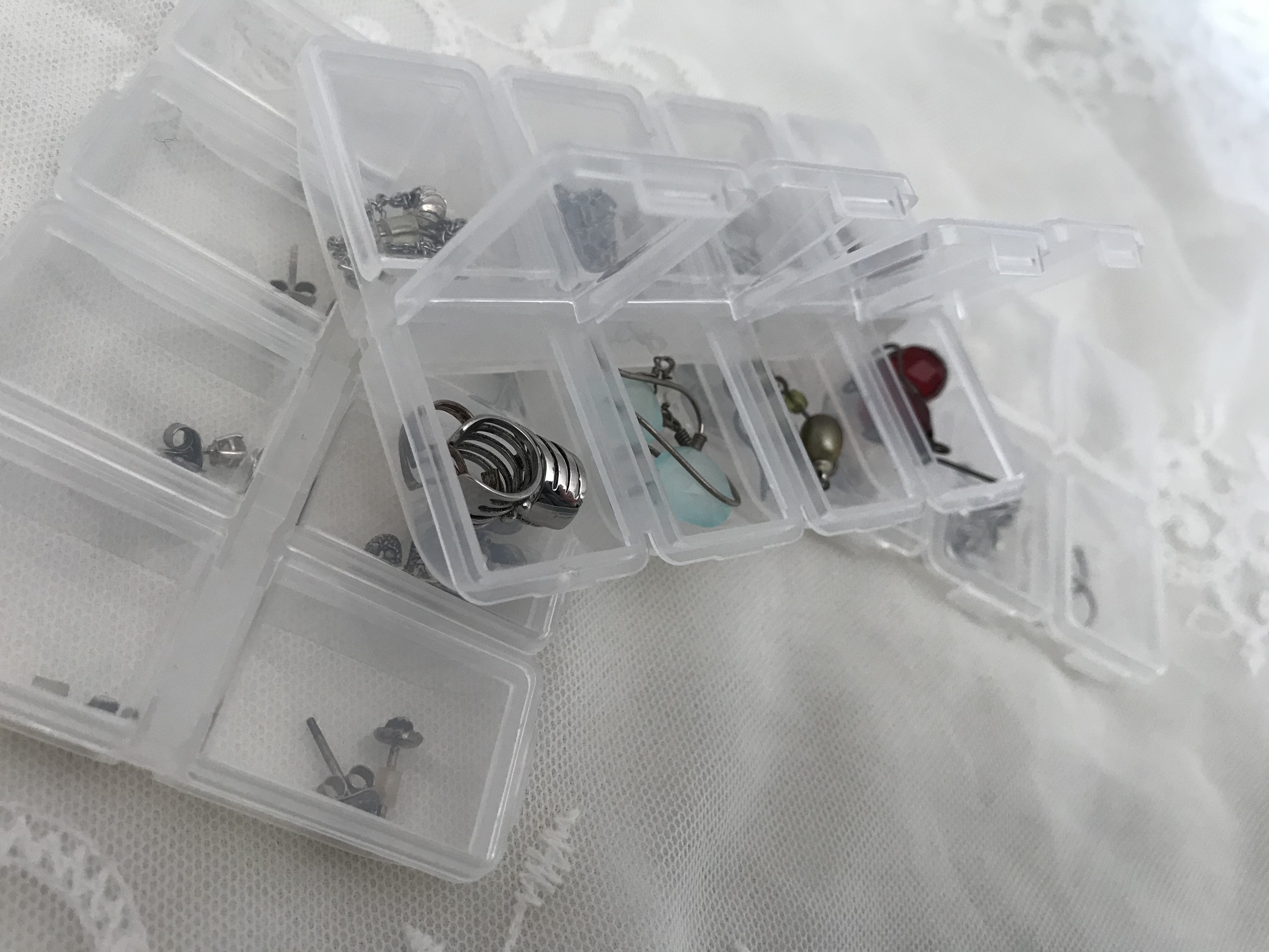 The next one is great for travel and guarantees that you won’t lose a single piece. I also use this storage method for my more expensive, smaller pieces. Finding a pill case is pretty easy these days or you can even find this type of container in the beading and crafts section at your local store. I like to either organize them by color or style lengths to make choosing easier for my outfits. What’s great about the pill cases is that they last for a very long time compared to the foam so it’s worth investing in strong clasp type boxes that snap firmly shut. I don’t recommend storing fine chained necklaces this way because the chain always tangles. If you do, store each one individually to prevent frustration later. Another great thing about this is that it really helped me realize I had too much jewelry and to spend less and use what I already owned.