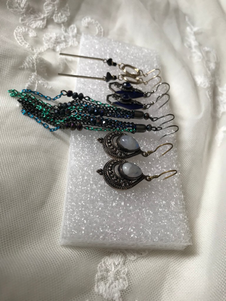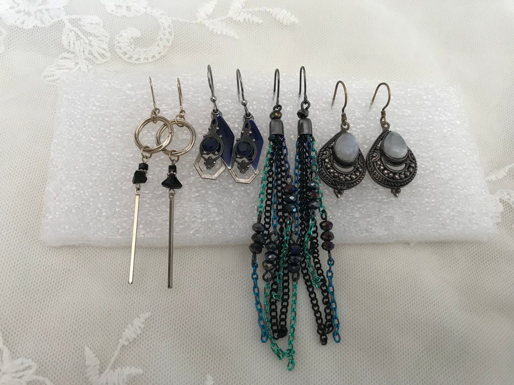 Styrofoam is magical and most likely you already have some. Packaging Styrofoam is easy to find in any size perfect for your jewelry box or storage box. It won’t damage the jewelry, never fades and is super cheap for on the go storage. All you have to do is cut it down to the size you need. With or without the earring backs just poke it deep into the foam. Large porous foam is not recommended as the earrings might not stick well or foam that is super compressed because it’s hard to get the earrings in. This worked for all my kinds of earrings but I liked that I could display my dangling earrings the best this way. Its not limited to just earrings but works well with necklaces too.