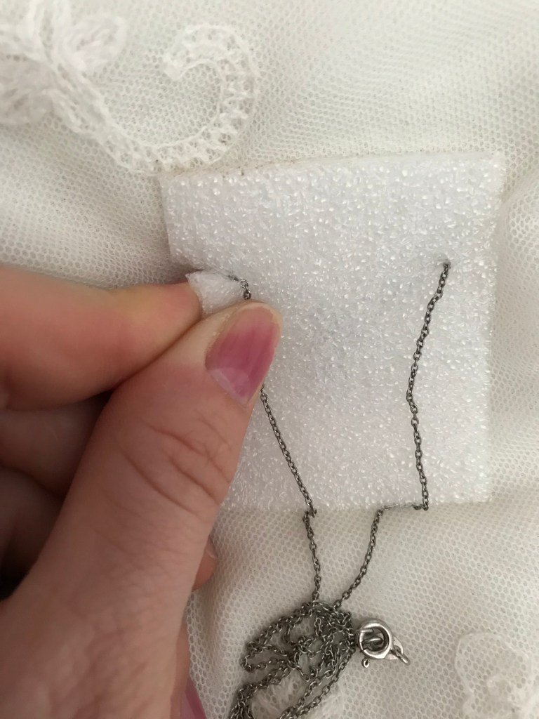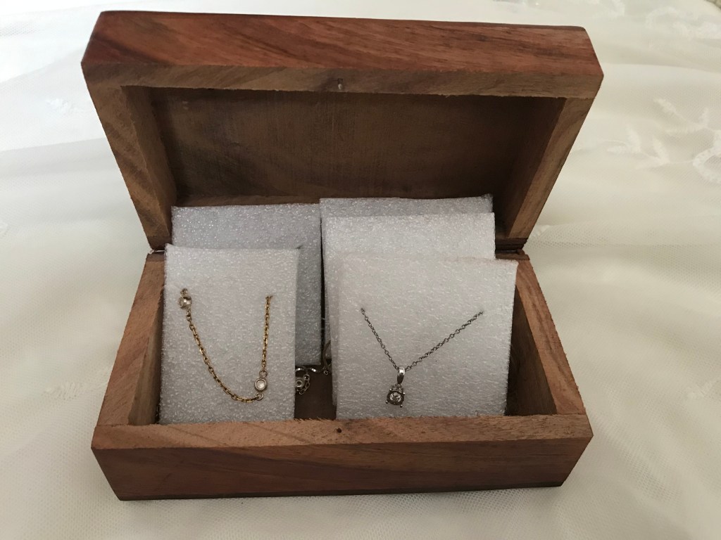 For storing necklaces, first cut a square of foam and make two slits then slide the chain through the slits on both sides until the desired length is achieved. The downside to this method is that the chain dangles in the back, but mine didn’t seem to get tangled or anything. Please don’t tape it to the back of the foam! I hated doing this when I worked in a jewelry store and it was a pain to remove not to mention small chains were often broken or left sticky. I wish I could recommend another method to store the chains, but I have yet to discover it. If you have an idea feel free to comment below! I also couldn’t find a way to use foam to store my thick bracelets. A side note for eco friendly storage is to invest in a nice wooden box as wood lasts for ages and can be refinished over and over if the wood is solid. Using carboard boxes are fine if you are trying to recycle but they are more susceptible to breakage, getting wet, storing mold and attracting bugs. Plastic boxes are also great but remember within about 5 years the plastic tends to break down and the latches will shatter over time.