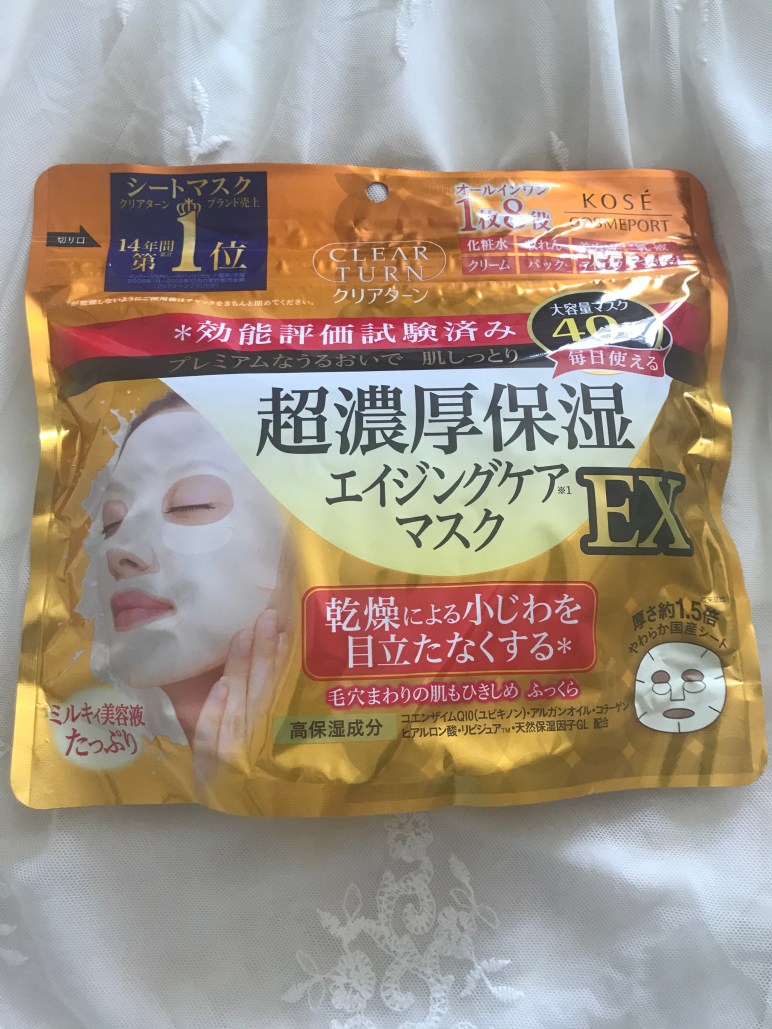 Skin moisturizing masks by Clear Turn (40 pieces, 680mL liquid) Deep moisturizing masks used for restoring moisture to dry skin. It prevents wrinkles with active ingredients such as Q10, collagen, and Hyaluronic acid. How to use* Cleanse face before using. Apply the paper mask and remove after 5-10 minutes. Pat skin to absorb the extra … Continue reading Ultra-Concentrated Moisturizing Mask ~ Japanese product review